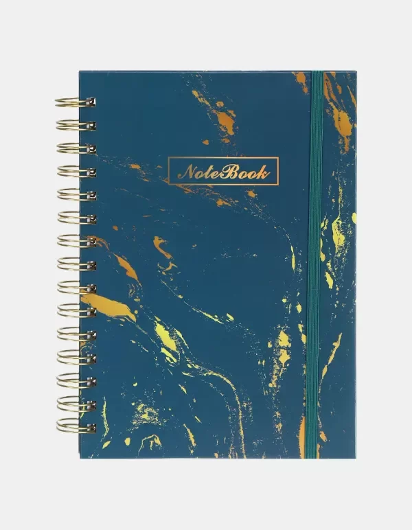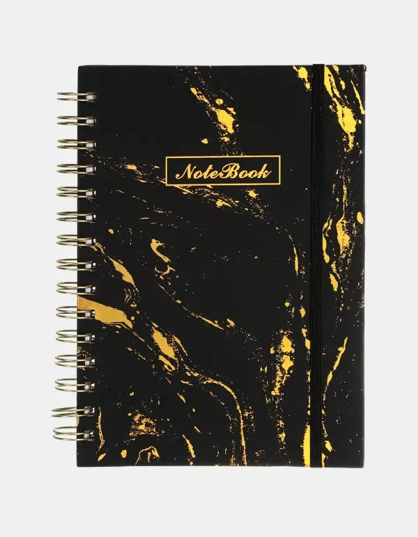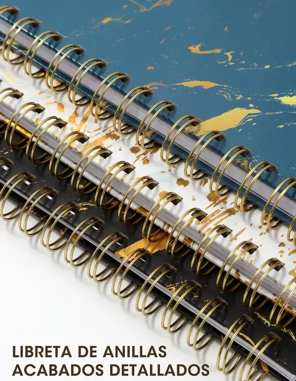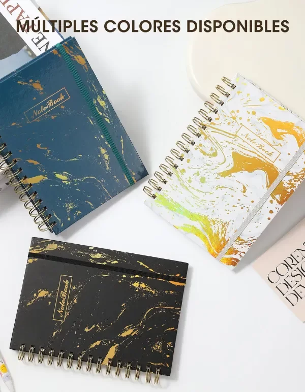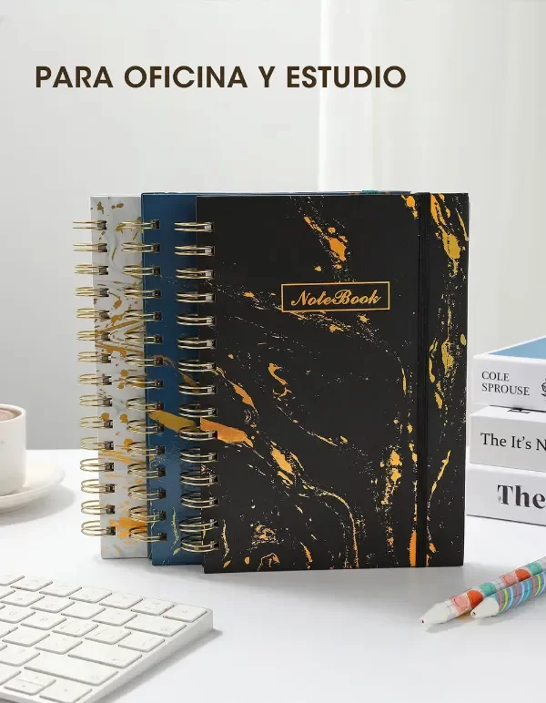 Elegante cuaderno anillado con tapa dura y acabado marmolado con estampado dorado, ideal para quienes buscan estilo y funcionalidad en su papelería. Su diseño sofisticado lo hace perfecto tanto para uso personal como profesional.