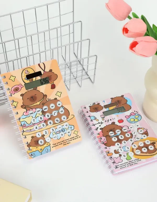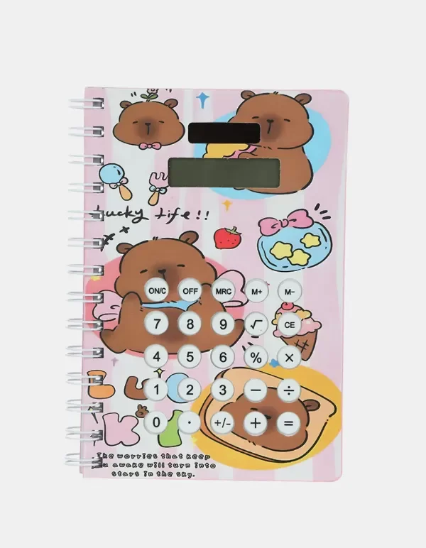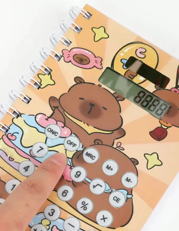 Este cuaderno con 80 hojas rayadas es perfecto para la escuela, oficina o llevar en la mochila. Su diseño de capybara no solo te va a sacar una sonrisa, sino que también incluye una calculadora funcional incorporada en la tapa para que hagas cuentas rápidas cuando lo necesites.