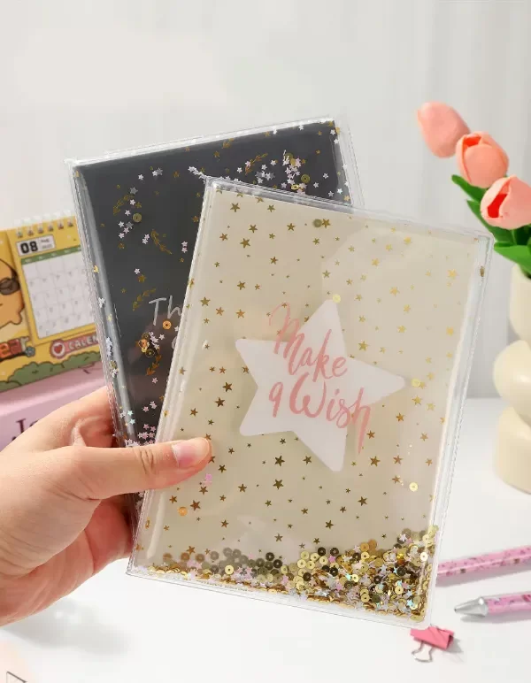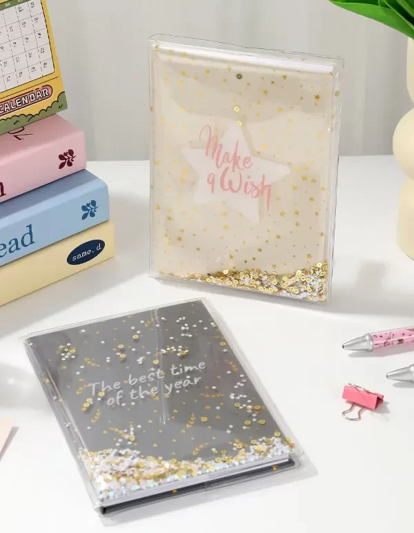 Cuaderno cosido con tapa dura. Cuenta con una funda protectora de PVC y lentejuelas fluidas. Incluye 80 hojas rayadas, ideal para estudio, trabajo o uso diario.