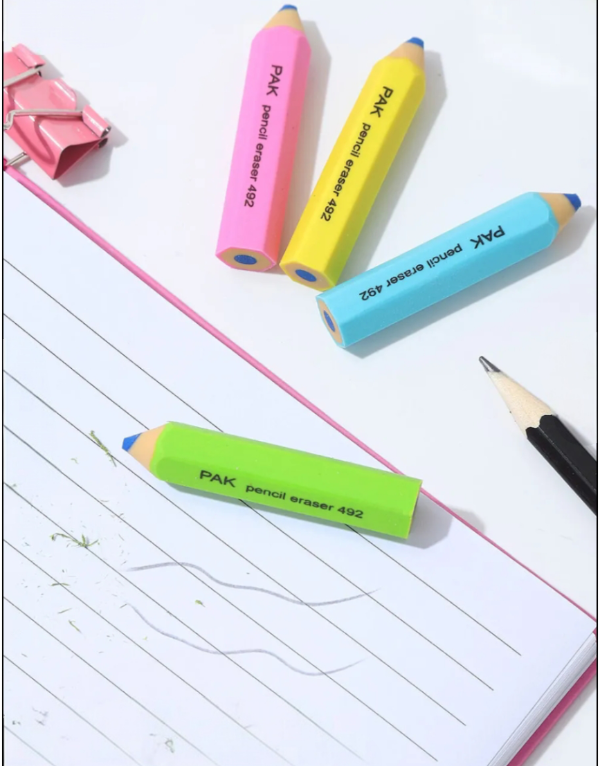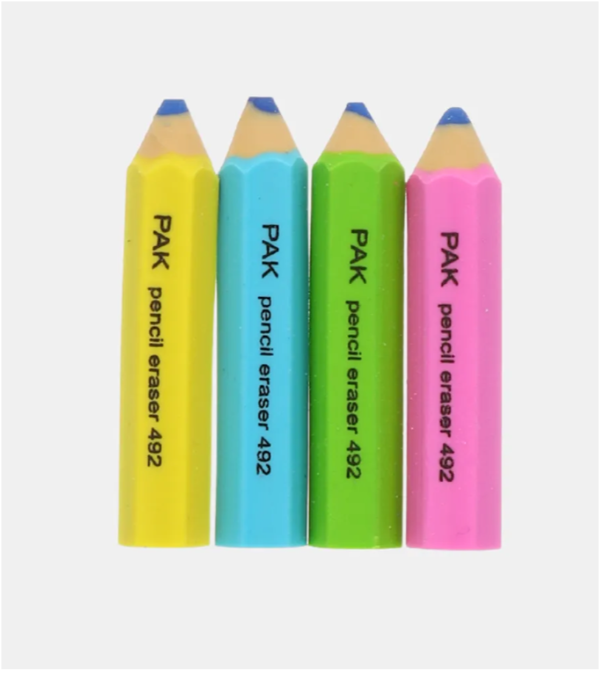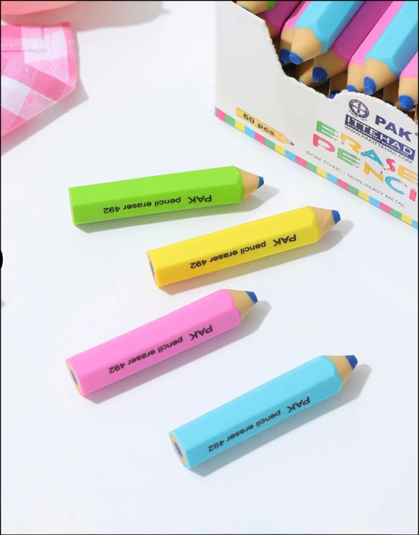Goma de borrar con diseño de forma de lápiz, divertida y colorida, ideal para uso escolar o como detalle creativo en el escritorio. Fabricada en goma suave y flexible, permite borrar lápices de forma limpia.