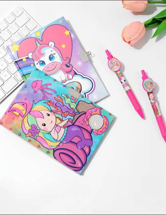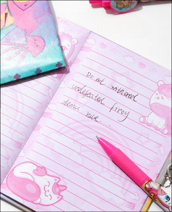 Incluye candado con llave, que permite guardar contenidos personales de forma segura, fomentando la privacidad. Cuenta con tamaño compacto, fácil de transportar en mochilas o bolsos. El set incluye además un bolígrafo, práctico para el uso diario.