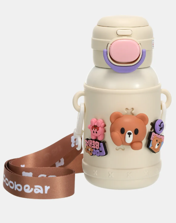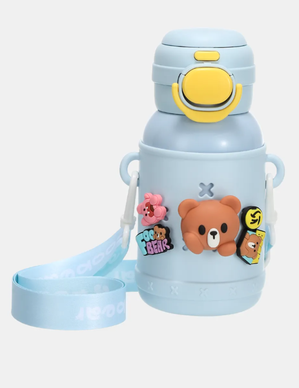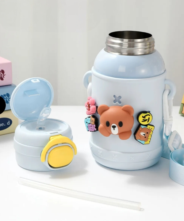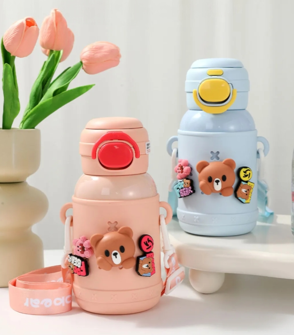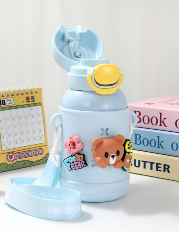 Botella térmica infantil con diseño de osito, ideal para uso diario en casa, escuela o salidas.