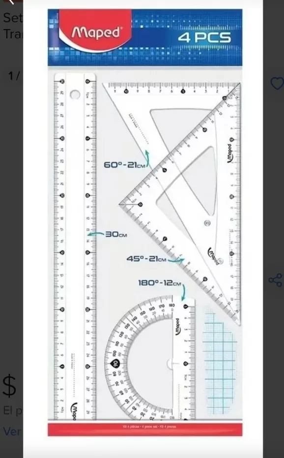 set de geomeria de 4 piezas el conjunto está compuesto por una regla de 30cm, dos escuadras de 21cm cada una con ángulos de 60° y 45° respectivamente, y un transportador de 180° de 12cm. Cada pieza está fabricada en plástico de alta calidad, garantizando su durabilidad y resistencia al uso constante