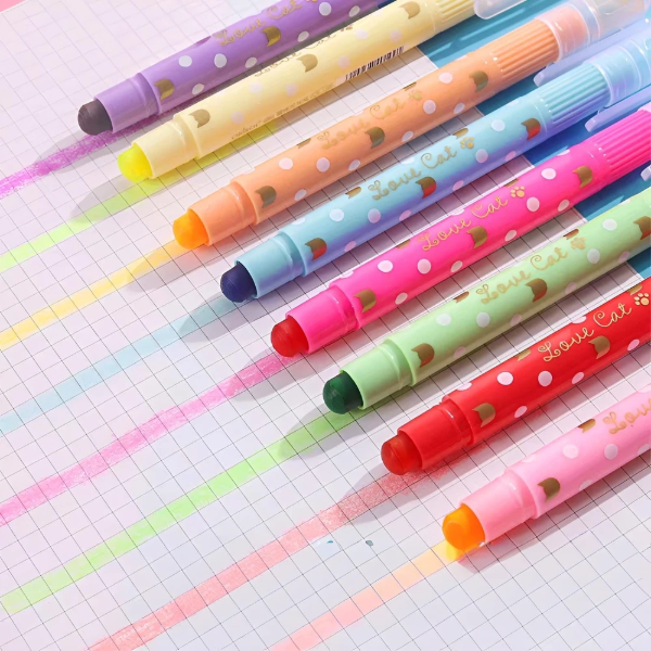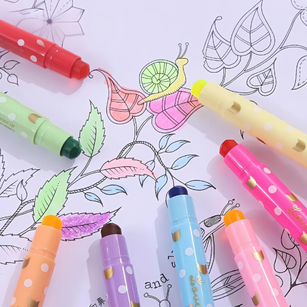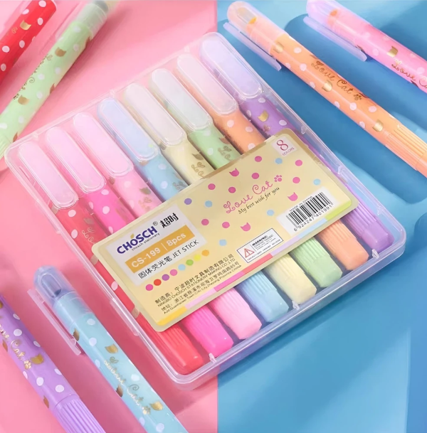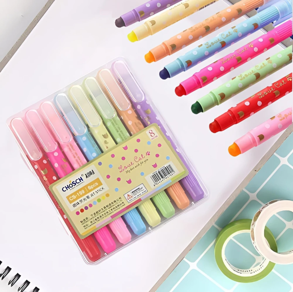 Resaltadores tipo crayón. Utilizan una fórmula de cera que proporciona colores vibrantes y opacos. No traspasan el papel, lo que los hace ideales para libros, biblias y documentos